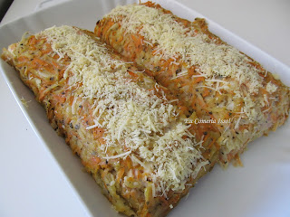 Rale as batatas e as cenouras (ralo grosso). Reserve. Bata os ovos levemente e misture com as batatas e cenouras raladas. Junte a cebola, o cheiro verde e tempere a gosto com sal e pimenta. Misture tudo muito bem. Abra uma folha de papel manteiga em uma assadeira grande. Unte bem o papel com margarina, manteiga ou óleo. Coloque a massa sobre o papel, espalhando na forma de um retângulo. Deve ficar assim: