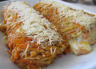 Leve para assar em forno preaquecido por cerca de 30 minutos, ou até que a massa fique "unida", formando um bloco único. Retire do forno, espalhe o requeijão, coloque o presunto e a muçarela. Enrole no sentido do comprimento, formando um rocambole. Polvilhe parmesão por cima. Leve novamente ao forno apenas para o queijo derreter. Retire delicadamente do papel e sirva.